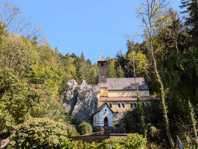 Auf der anderen Seite der Hängebrücke sieht man schon das Gasthaus zum Klobenstein, die namensgebenden beiden zerklüfteten Felsen - und die Mariahilf-Kirche.
