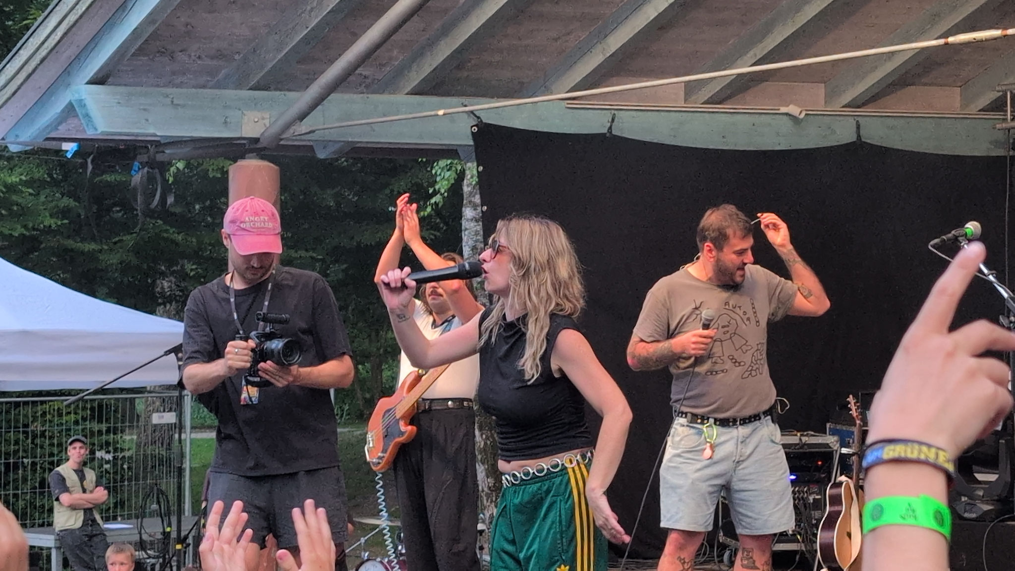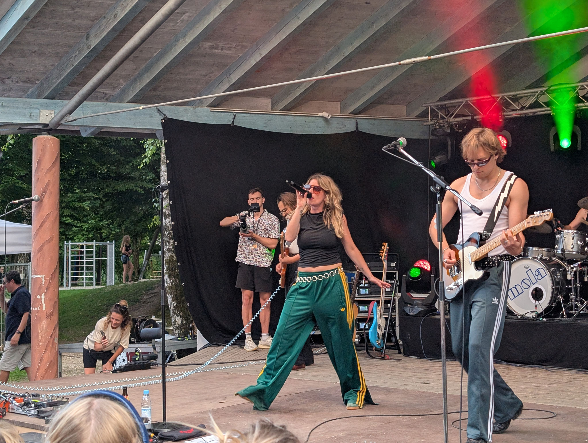 Nach dem gelungenen Start wächst das „Im Grünen“ schon im zweiten Jahr – ohne seine Bodenständigkeit zu verlieren. Petsch Moser, damals auf FM4-Dauerrotation, stehen neben Disgrace und Torpedo Schoenfeld auf der Wiese.
