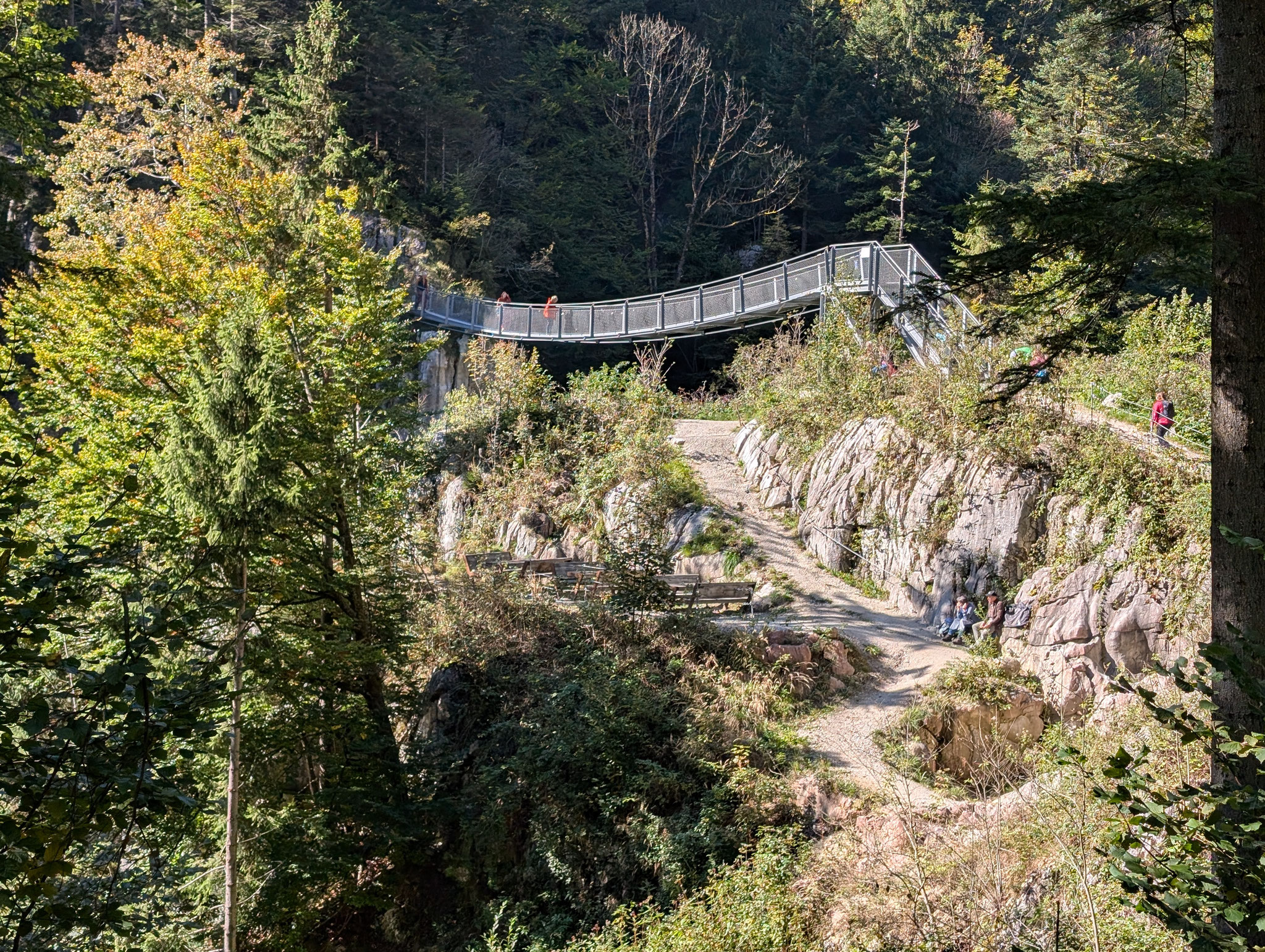 Auf dem neuen Schmugglerweg - Rundweg zwischen den beigen Hängebrücken sind einige neue Rastplätze und Brotzeitbankerl aufgestellt. Das gesamte Areal wurde zu einer Begegnungsstätte vor atemberaubender Naturkulisse ausgebaut. Und genau dies ist die Idee des neuen Rundwegs: Eine brückenschlagende Verbindung zwischen Bayern und Tirol, zwischen beiden Seiten der Tiroler Ache. Das ist definitiv gelungen.