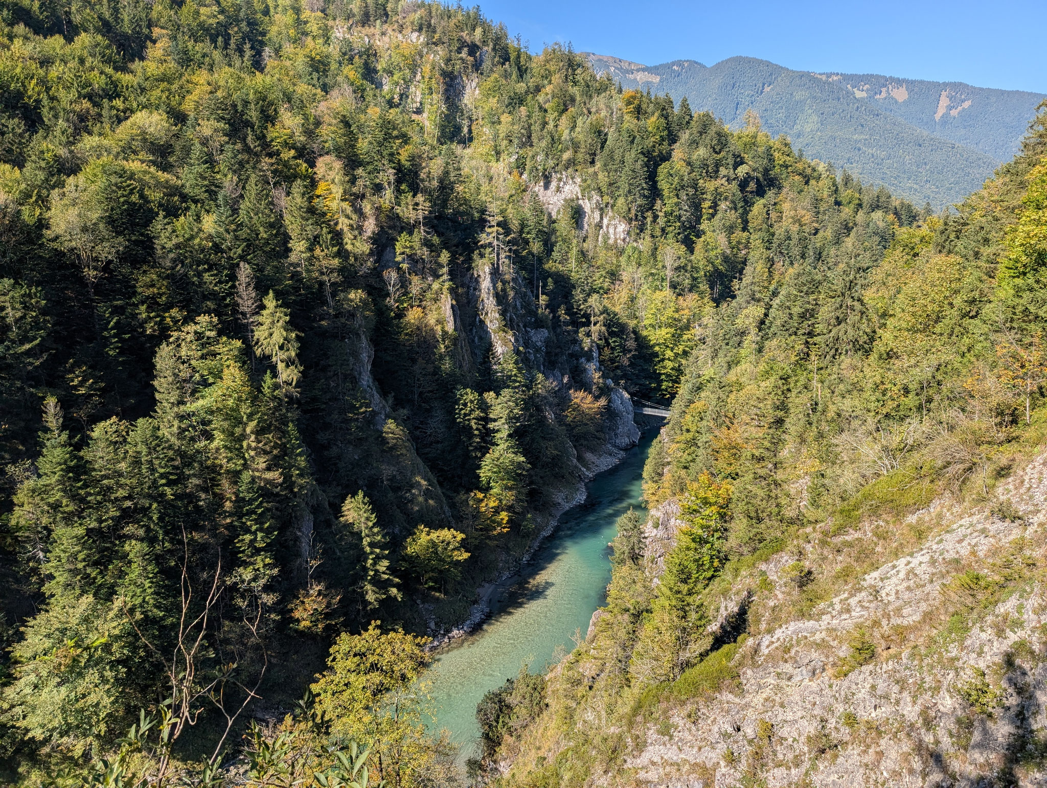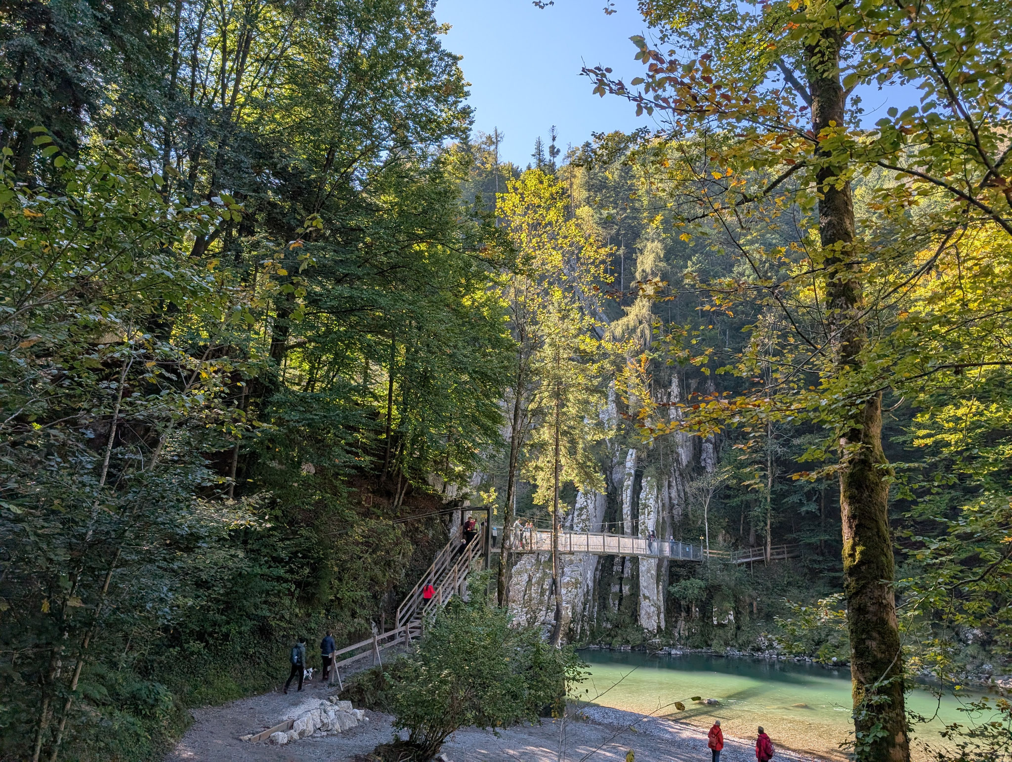 Von der Hängebrücke hat man einen tollen Blick auf das grünlich schimmernde, wild fließende Wasser. Meist kann man hier auch Rafting- und Kajakfahrern zuschauen.