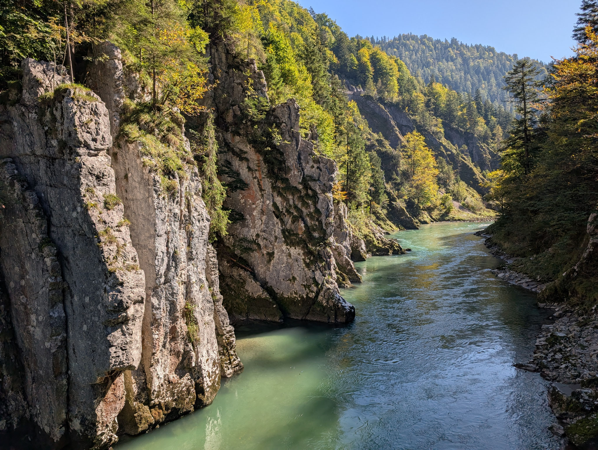 Wer möchte, kann auf dem Weg zurück zur Forststraße noch der Beschilderung zur "Schönen Aussicht" folgen. Wenig überraschend geht es zunächst tatsächlich bergauf, wo man auch wirklich eine schöne Aussicht auf die Tiroler Ache und die Rafting-Fahrer hat. Der Feldweg führt bis hinunter zum Fluss wo man gerne die Füße im eisig klaren Gebirgswasser kühlen kann.