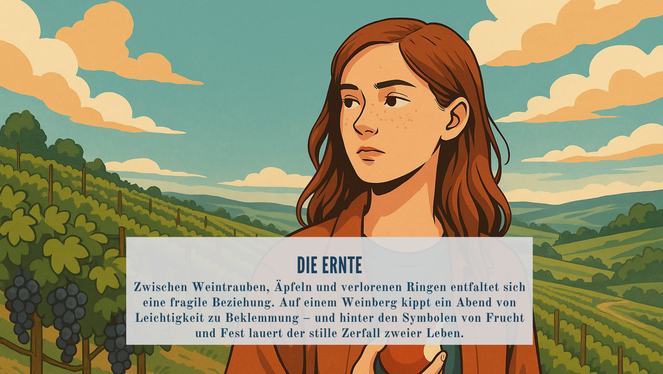 Die Ernte zeichnet sich durch eine fragmentierte, fast traumartige Erzählweise aus, die eine Mischung aus Alltäglichkeit und unterschwelliger Bedrohung schafft. Die scheinbar banalen Motive – Weintrauben, Äpfel, Ringe – verwandeln sich im Laufe der Handlung in Symbole für Begehren, Verlust und Zerfall von Beziehungen. Zur Geschichte