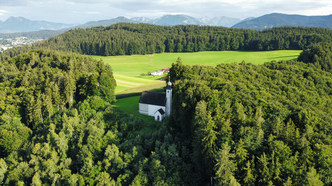 Das Ettendorfer Kircherl, hoch oben auf seinem Hügel, erscheint aus der Vogelperspektive wie ein stiller Wächter über dem Chiemgau. Umgeben von sanften Wiesen und Wäldern, hebt sich die kleine Kirche mit ihrem markanten Turm deutlich ab und bietet ein Bild der Besinnlichkeit und Ruhe. Die geometrischen Muster der Felder und Wege, die sie umgeben, verstärken den Eindruck von Harmonie und Ordnung. Dieses Luftbild fängt die friedvolle Schönheit und die zeitlose Erhabenheit dieses besonderen Ortes ein – ein stiller Rückzugsort, der zum Innehalten und Staunen einlädt. Klick hier für mehr Geschichten über das Kircherl